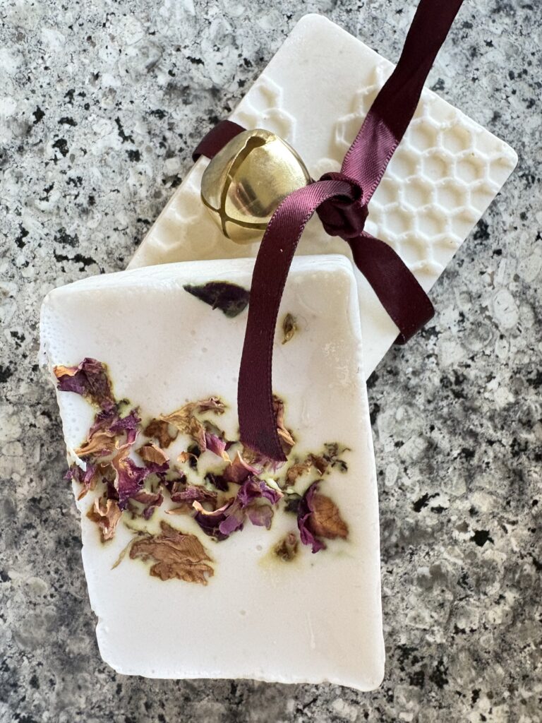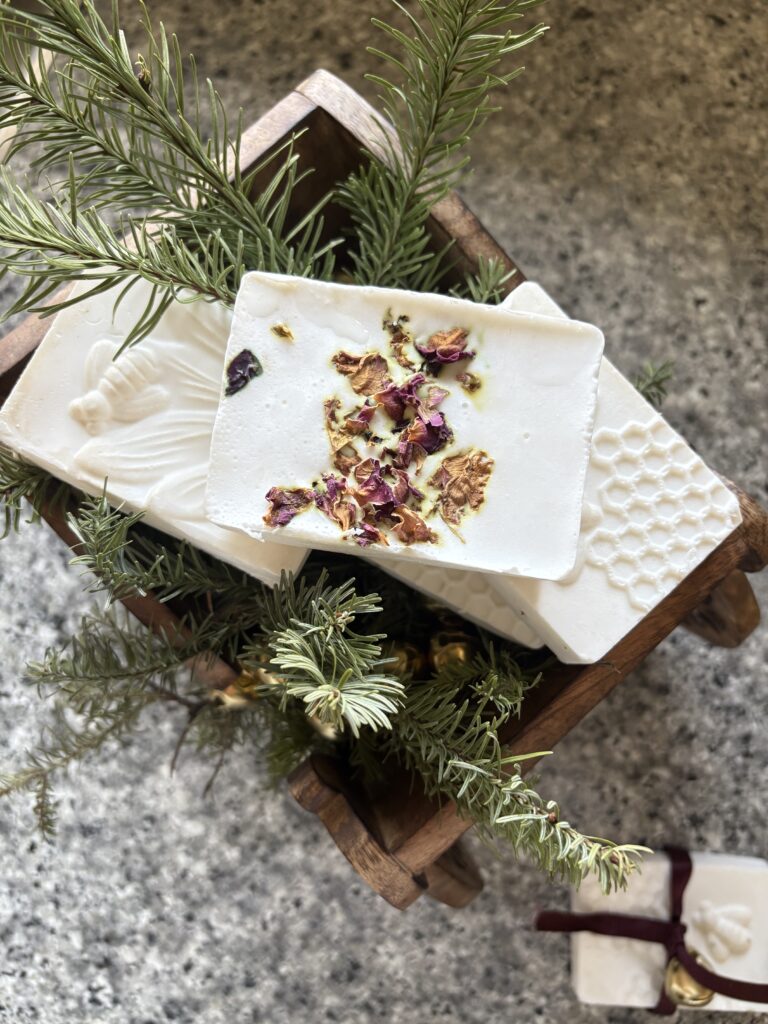 This time around, I added dried rose petals to the bar soaps and they turned a little green and red, which is perfect for the Christmas season. I also dropped some peppermint oil in them for a fresh winter scent, but the base I used already had a nice smell to it too.