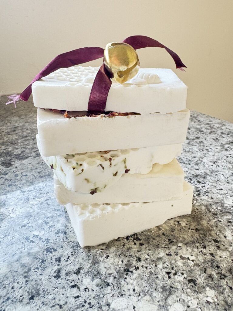 What I love most about the melt and pour bar soap is that it is so fun to experiment with different essential oils to get different fragrances. Another idea to get different textures in the bar soap is to add different dried flowers, grinded coffee beans, or oats for a pretty bar soap. They are beautiful, but they do get more messy, so you can just make them plain with essential oils for a plain white bar soap that smells heavenly if that’s your preference.
